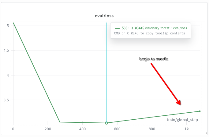 Evaluation loss starts to increase around step 600, indicating the beginning of overfitting